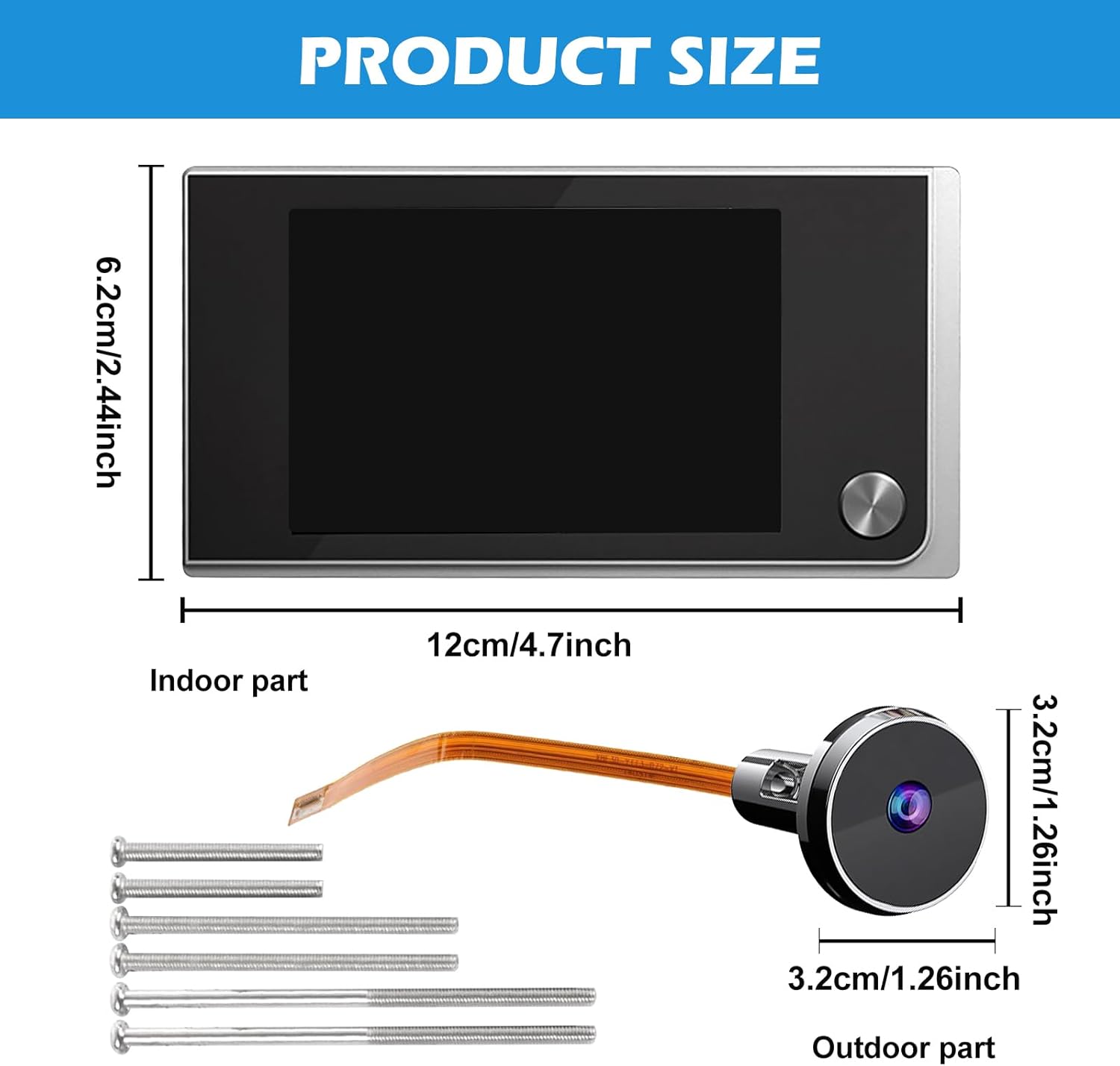 Special feature: 1. The electronic door viewer is equipped with a 3.5 inch TFT LCD screen and a 2MP hidden camera. Thanks to the 170° wide angle, the door camera reliably captures all visitors and ensures a clear, detailed picture. 2. The robust zinc alloy housing makes the electronic door viewer particularly stable and durable. The high-quality workmanship and anti-damage design provide effective protection for your home and ensure a long service life. 3. Quick and easy installation without specialist knowledge: the electronic door viewer is suitable for door thicknesses of 35-100 mm and door holes of 13-28 mm. Thanks to battery operation with four AAA batteries (not included). Specification: Screen size: 3.5 inch TFT LCD. Camera resolution: 2 megapixels. Viewing angle: 170°. Camera Type: Mini Hidden Camera Material: zinc alloy. Door hole diameter: 13-28 mm. Suitable door thickness: 35-100 mm. Power supply: 4 x AAA batteries (not included). External device size: 147 x 46 x 135 mm (as pictured). Colour: silver. Package Content: 1 x electronic door viewer set. Note: 1. When installing, choose screws of suitable length according to the door thickness and assemble bracket and ribbon cable carefully according to instructions so that everything remains firmly connected. 2. When inserting the batteries, pay attention to the polarity and preferably use new batteries for proper operation. 3. If the display does not work as usual or does not show a picture, please check the ribbon cable for correct fit and any damage. 4. If you have any problems with switching on or automatic off, please check the battery charge or replace the batteries. 5. After successful installation, remove the protective film from the indoor and outdoor unit.